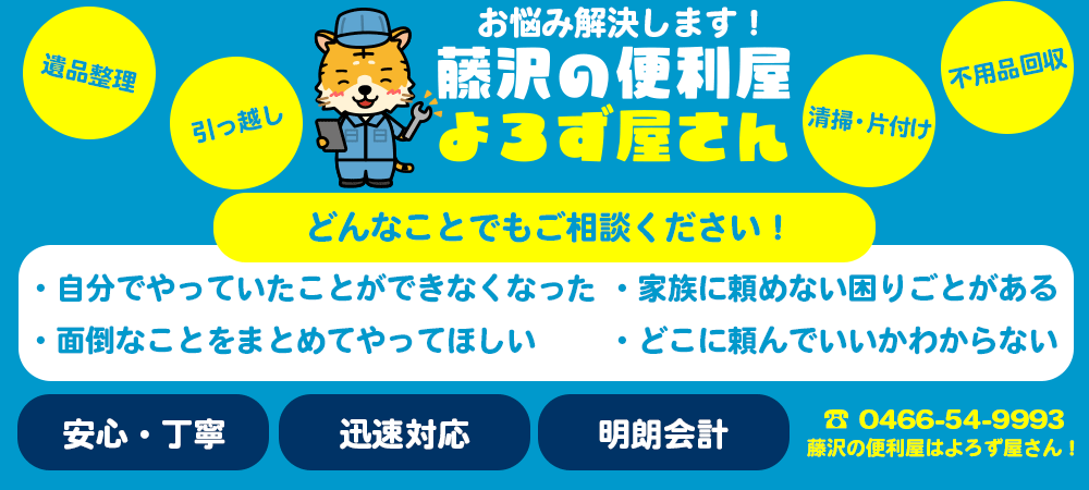 年齢を重ねるにつれ、今までできていた家事が負担に感じることはありませんか?掃除や洗濯、庭の手入れが思うようにできず困っている… そんな時は、私たち便利屋にご相談ください!「こんなこと頼んでいいの?」と思うことでも大丈夫。藤沢市密着の信頼と実績を持つ「よろず屋さん」にお任せください!
